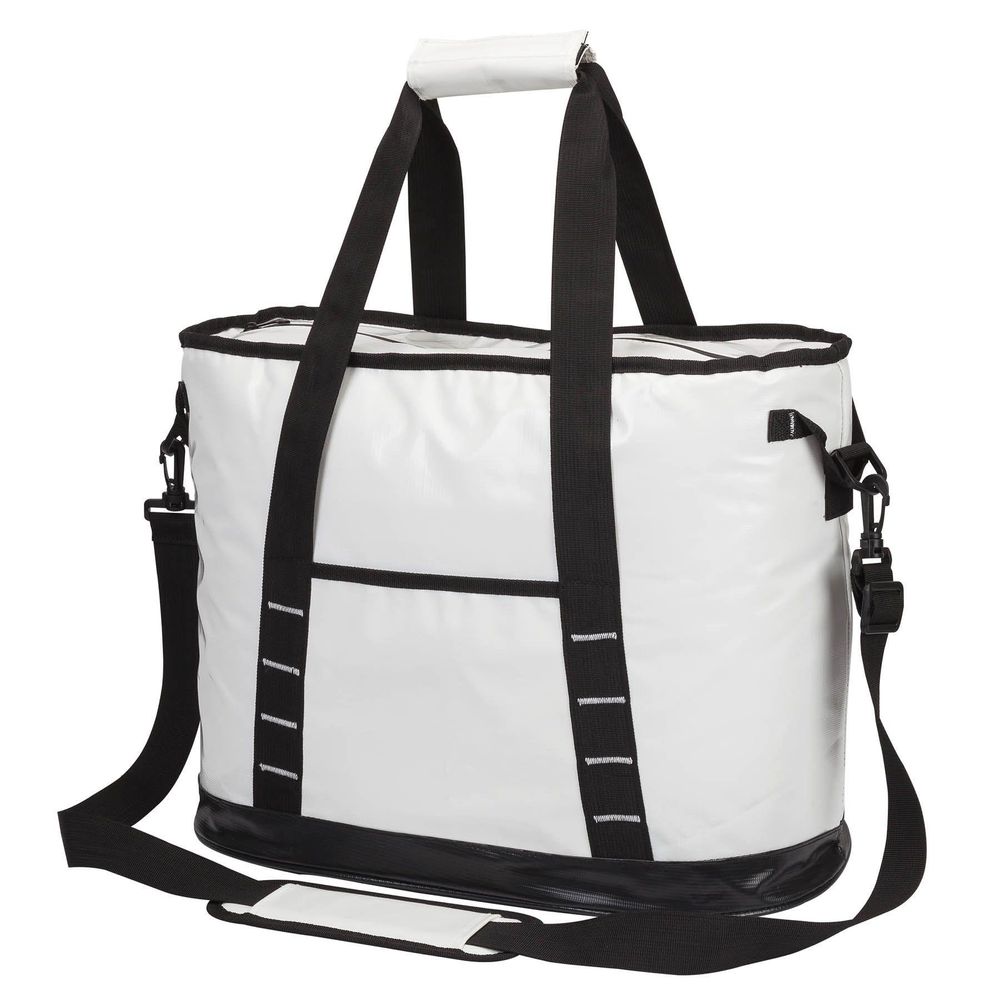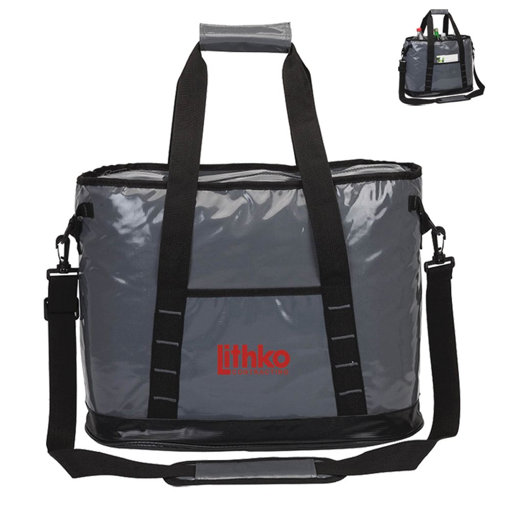 The Glacier 45C tarpaulin cooler bag with heat sealed PEVA-insulated lining holds up to 24 cans and features a water resistant exterior and zippered main compartment. It has a front pocket, 2 handles with hook and loop grip, 2 side carry handles for easy maneuvering and a removable and adjustable, 1 1/2" x 47" padded shoulder strap with swivel clips.