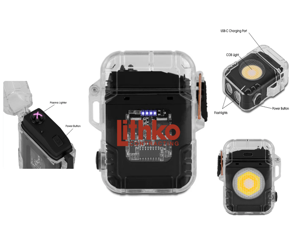 This innovative plasma lighter features a sleek design made from a durable blend of PC, ABS, and zinc alloy with a clear housing. It includes a type-C charging port for modern convenience and a power display to monitor battery life. The device is fully waterproof and equipped with double arc ignition for reliable use in any weather. It boasts a versatile lighting system with COB and LED wicks, offering adjustable brightness from 80 to 400 lumens in various colors and modes. 2m W x 3" H x 7/8" Diameter